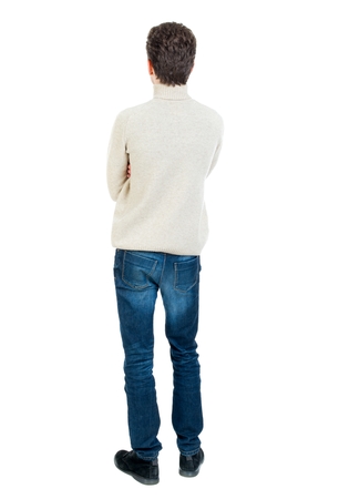 T シャツとジーンズを探して若い男の後ろ姿 若い男が立っています リア人のコレクションを表示します 人の裏面表示 白い背景に分離されました の写真素材 画像素材 Image